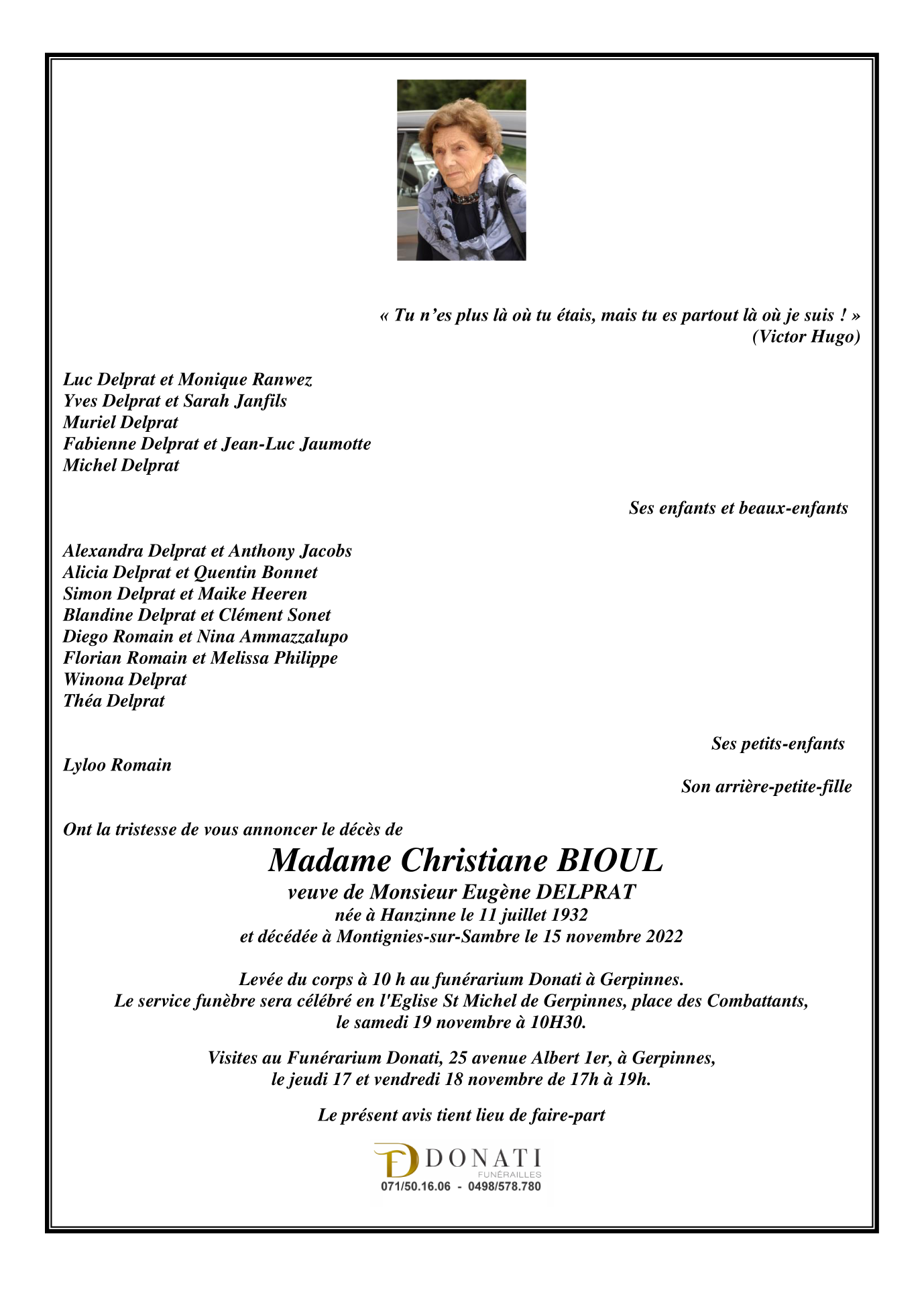 Décédée à Montignies-sur-Sambre (6061) le mardi 15 novembre 2022 à l'âge de 90 ans