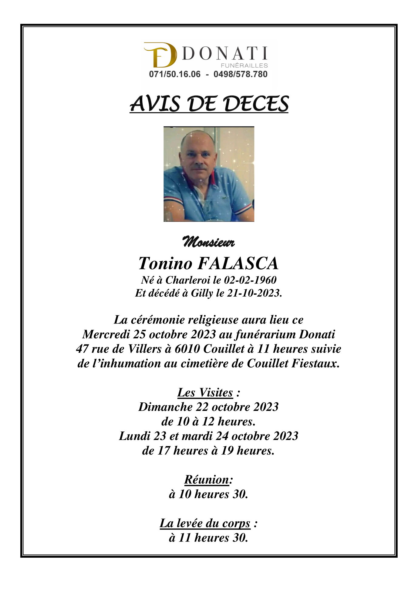 Décédé à Gilly (6060) le samedi 21 octobre 2023 à l'âge de 63 ans