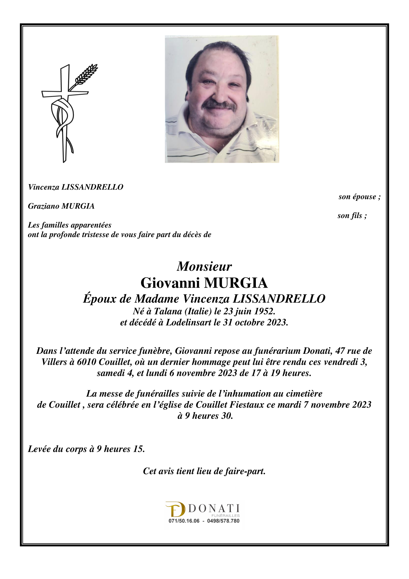 Décédé à Lodelinsart (6042) le mardi 31 octobre 2023 à l'âge de 71 ans