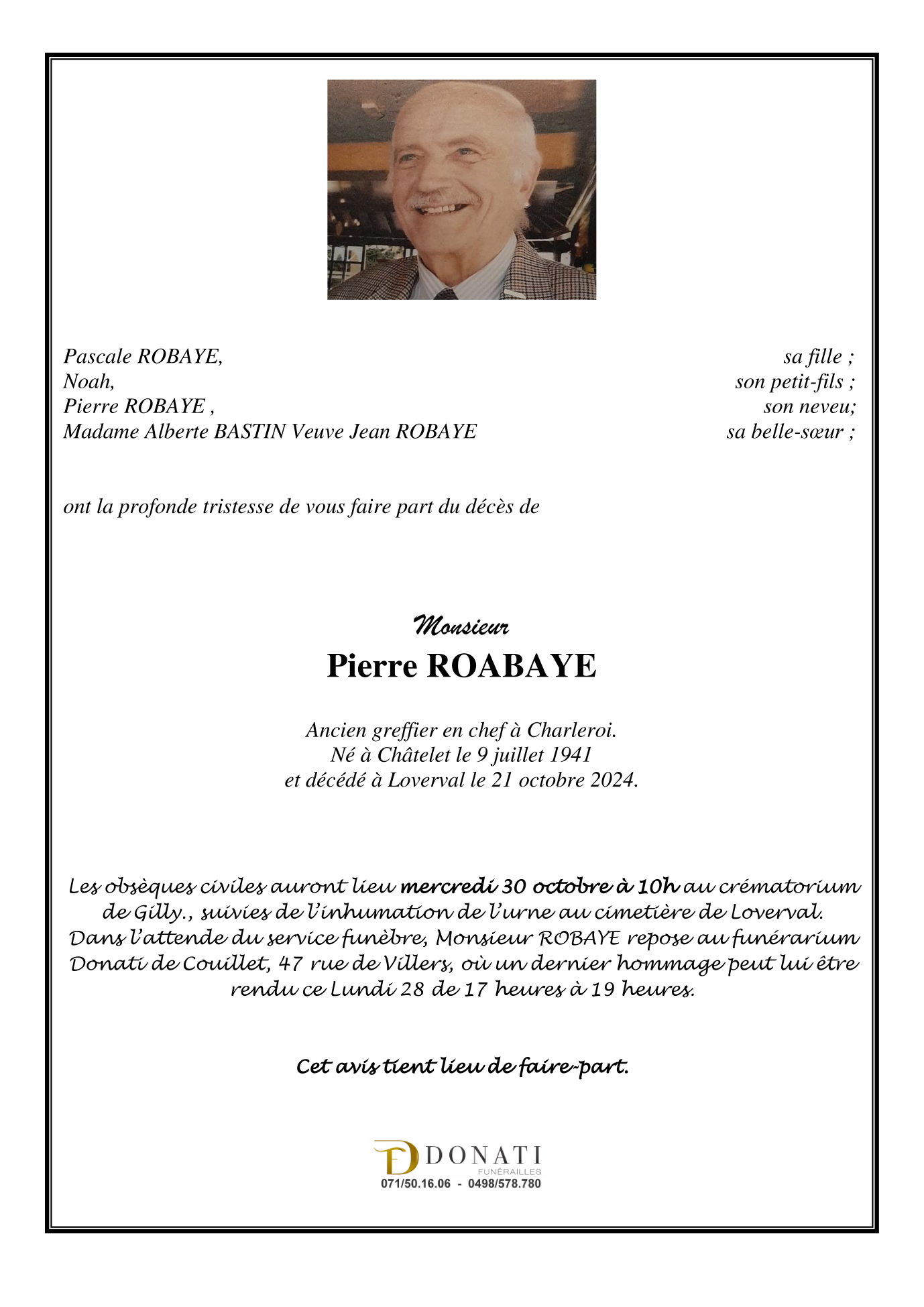 Décédé à Loverval (6280) le lundi 21 octobre 2024 à l'âge de 83 ans