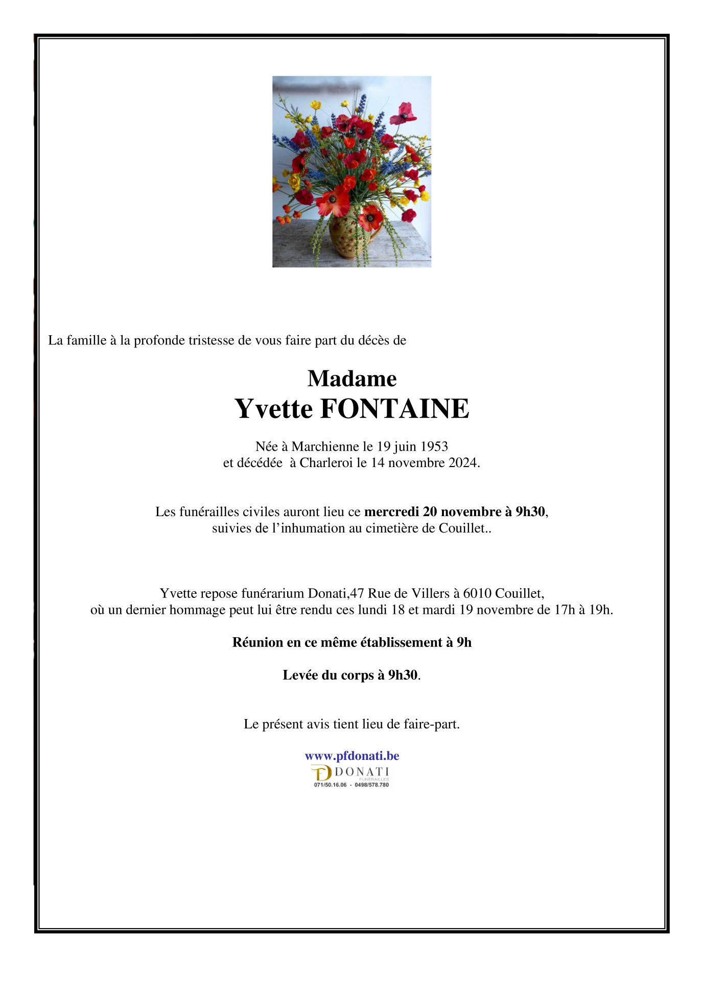 Décédée à Lodelinsart (6042) le jeudi 14 novembre 2024 à l'âge de 71 ans