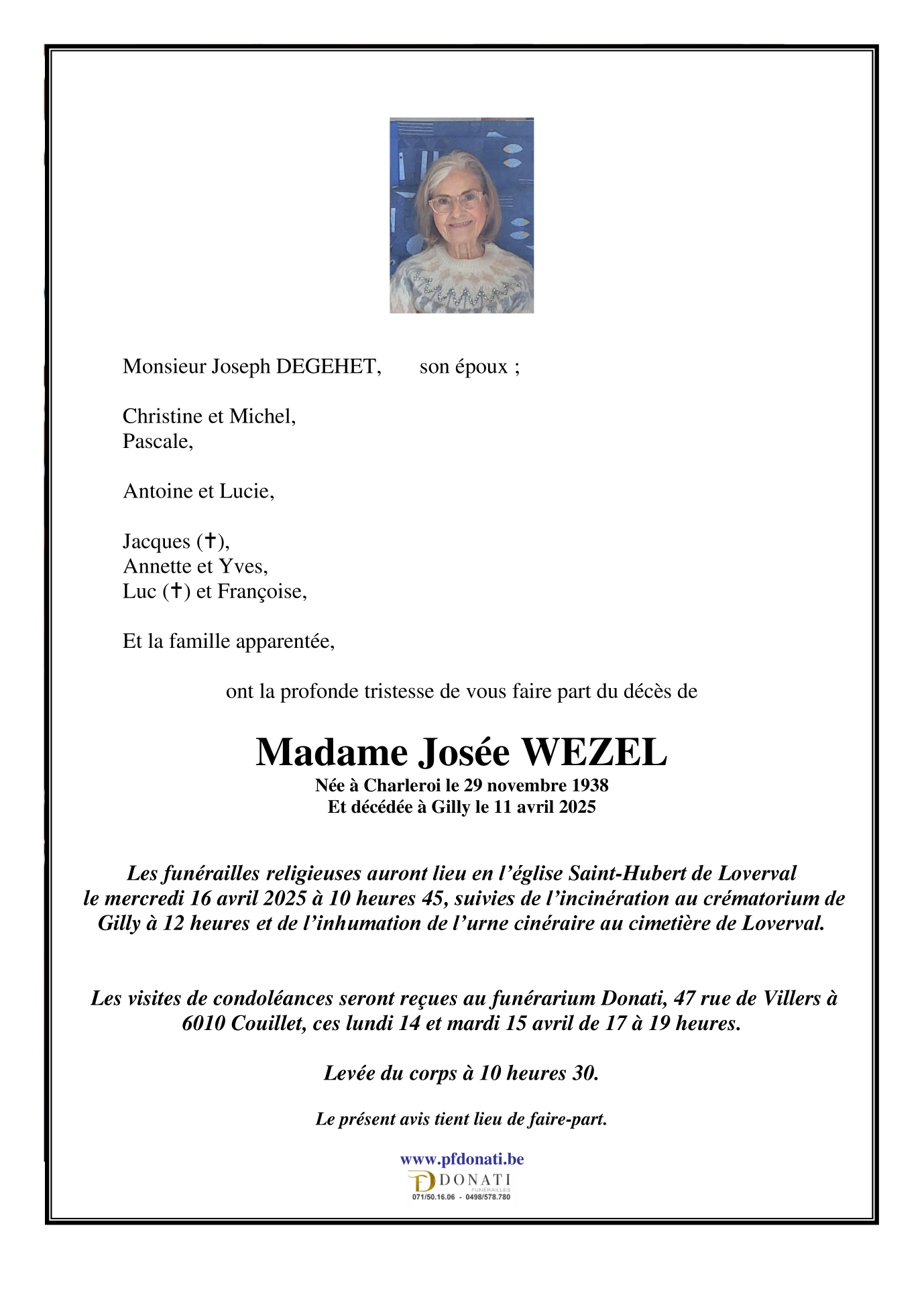 Décédée à Gilly (6060) le vendredi 11 avril 2025 à l'âge de 86 ans