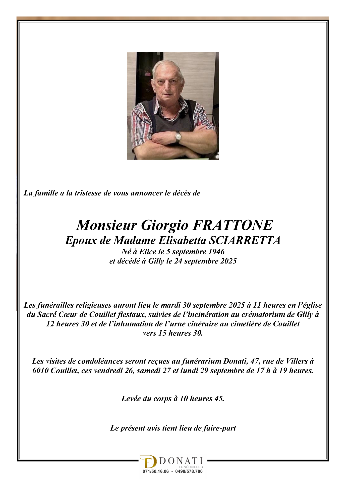 Décédé à Gilly (6060) le mercredi 24 septembre 2025 à l'âge de 79 ans