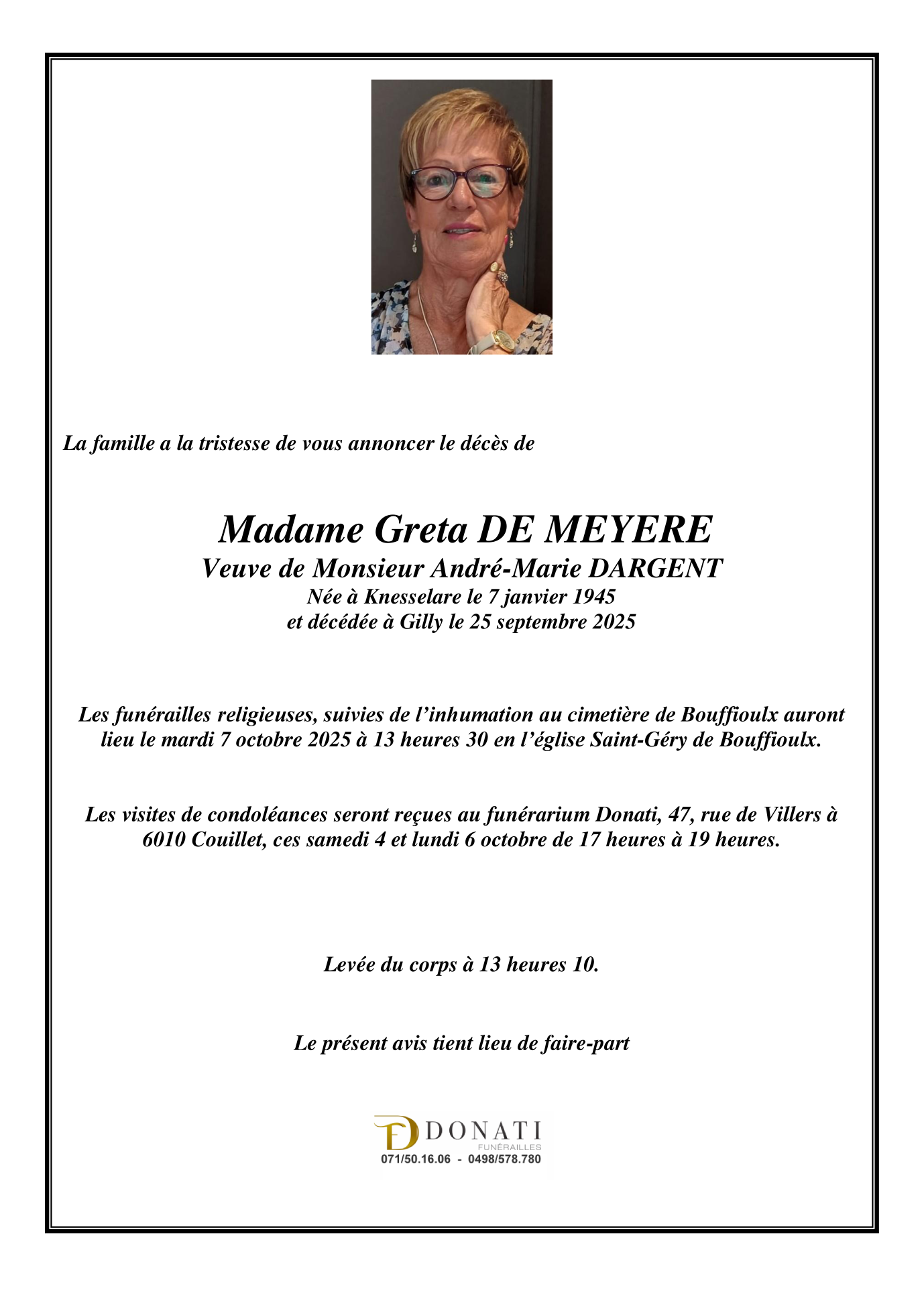 Décédée à Gilly (6060) le jeudi 25 septembre 2025 à l'âge de 80 ans