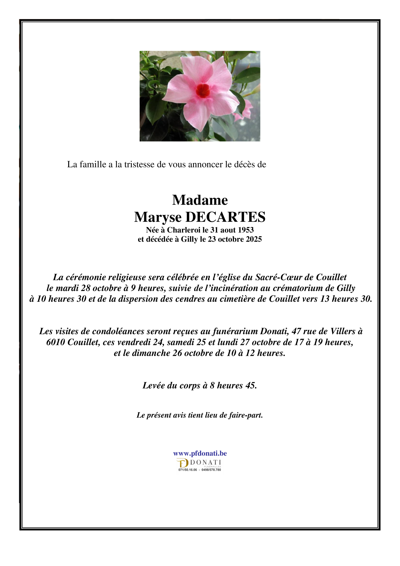 Décédée à Gilly (6060) le jeudi 23 octobre 2025 à l'âge de 72 ans