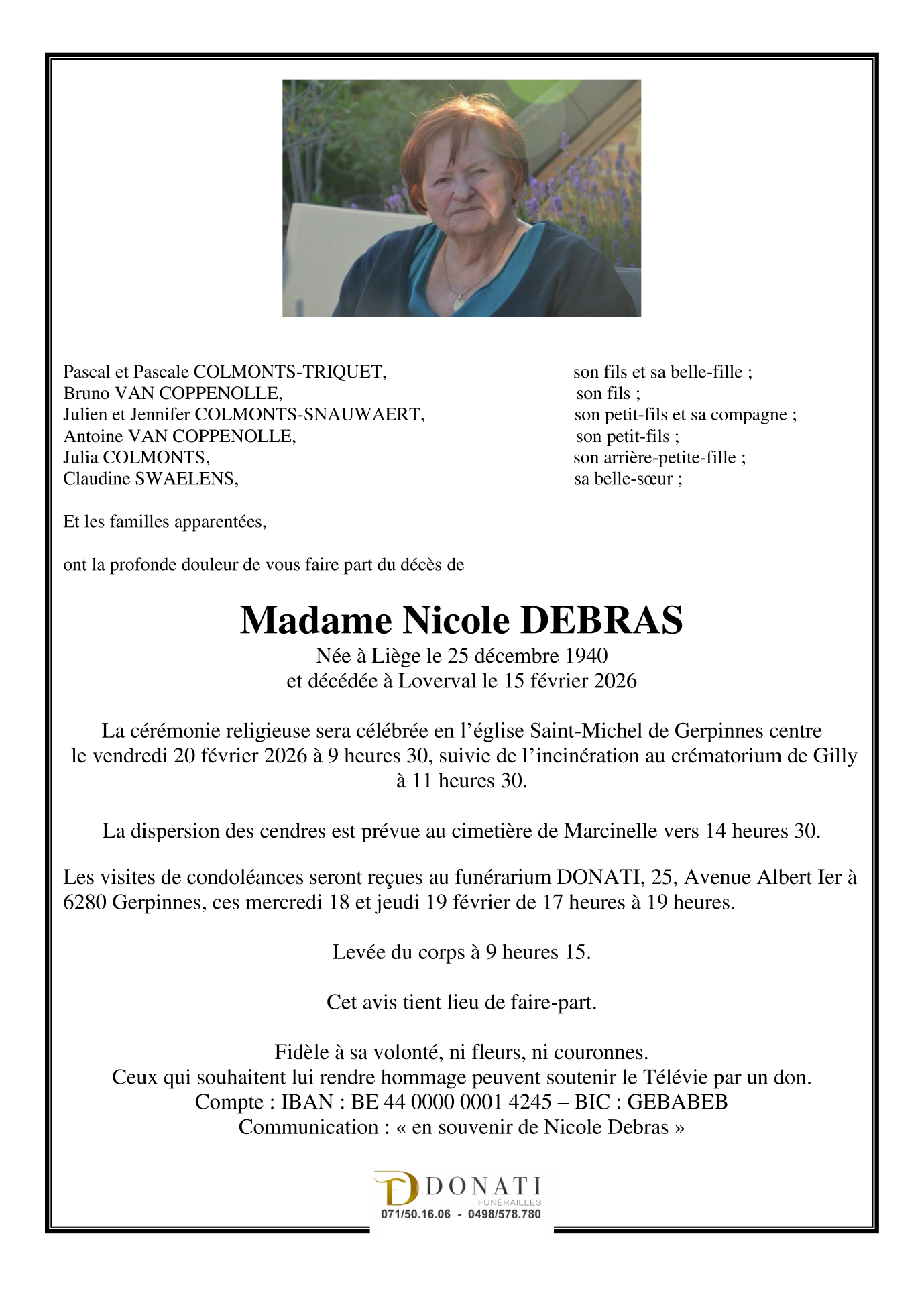 Décédée à Gerpinnes (6280) le dimanche 15 février 2026 à l'âge de 85 ans