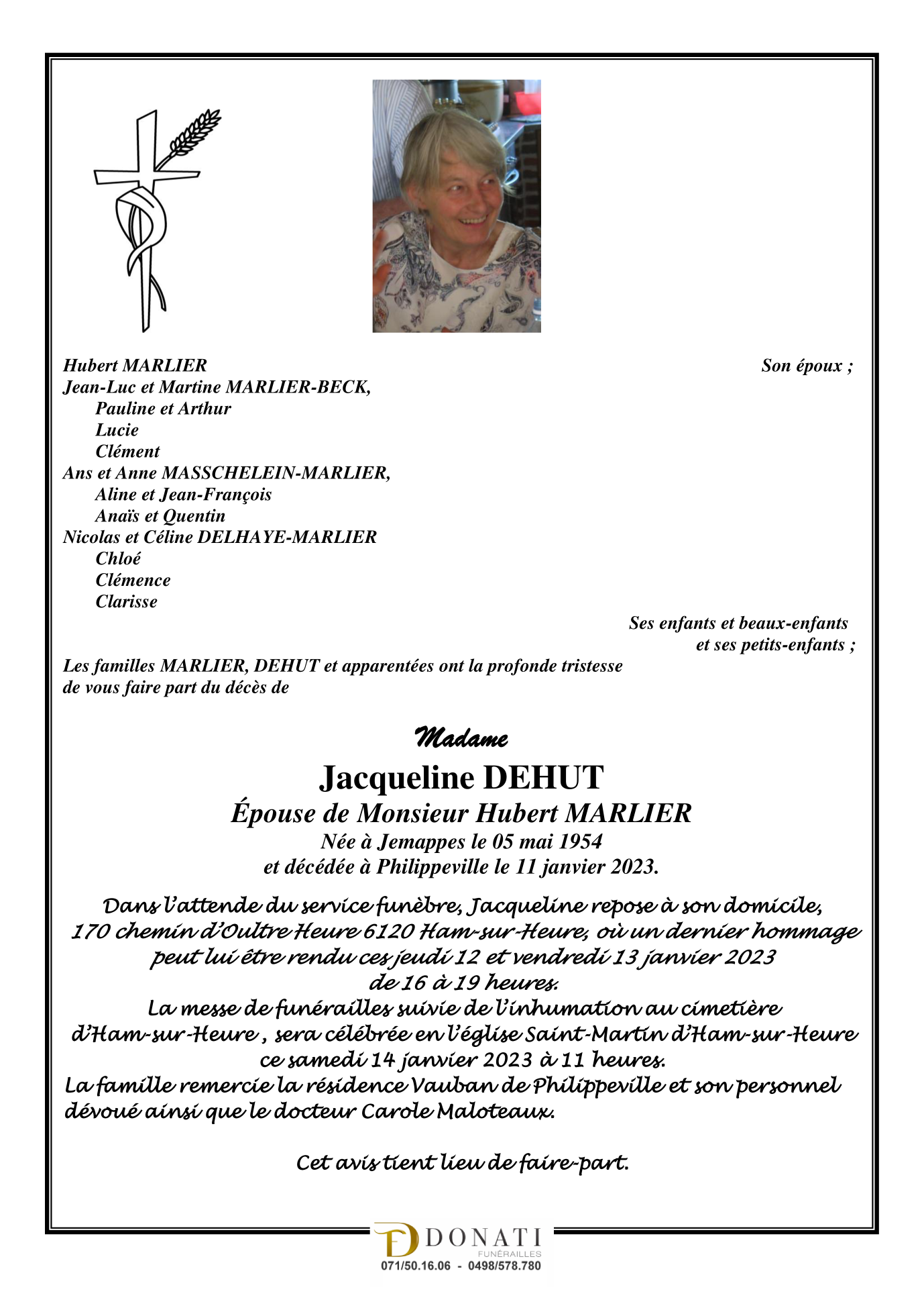 Décédée à Philippeville (5600) le mercredi 11 janvier 2023 à l'âge de 68 ans