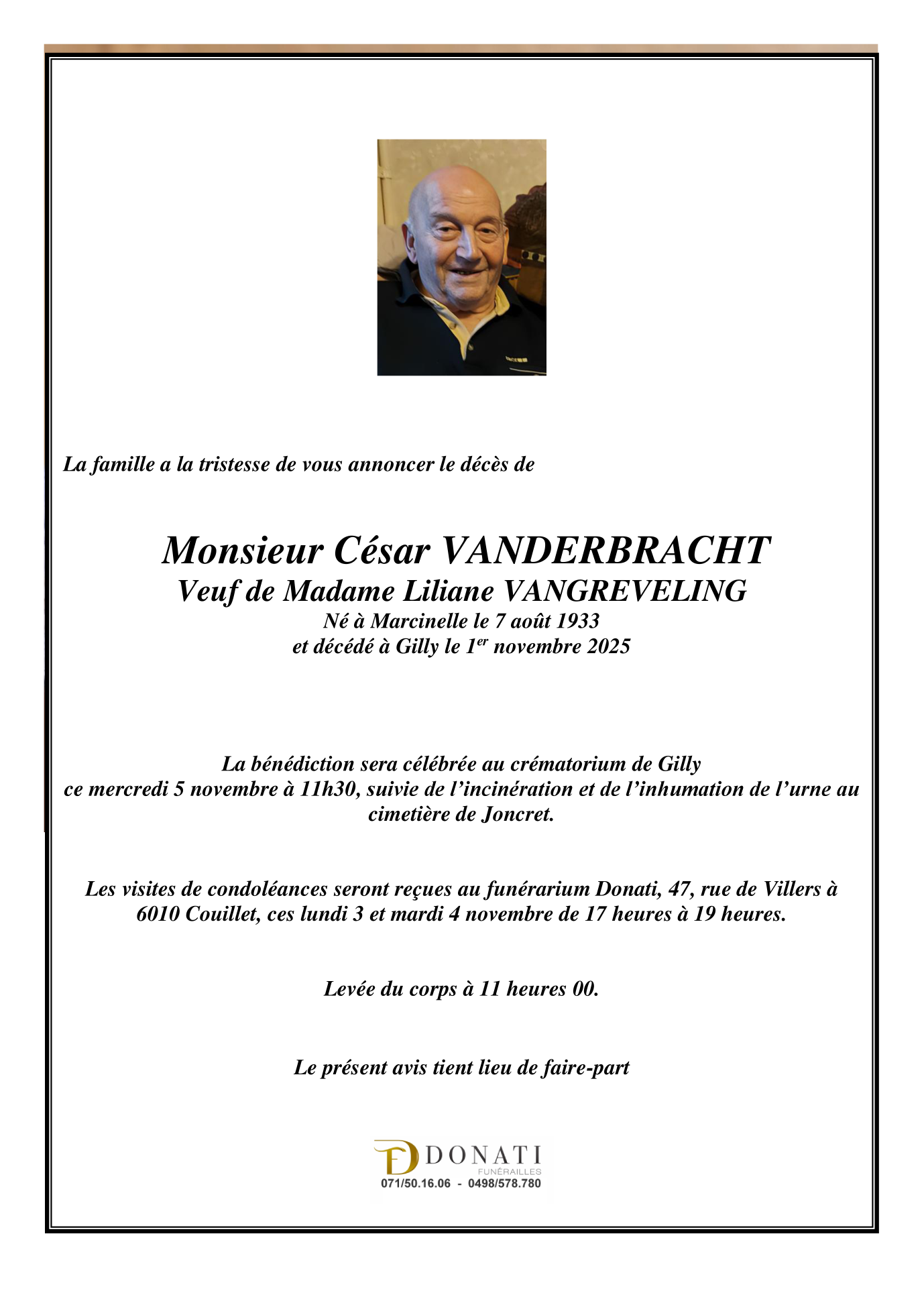 Décédé à Gilly (6060) le samedi 1 novembre 2025 à l'âge de 92 ans