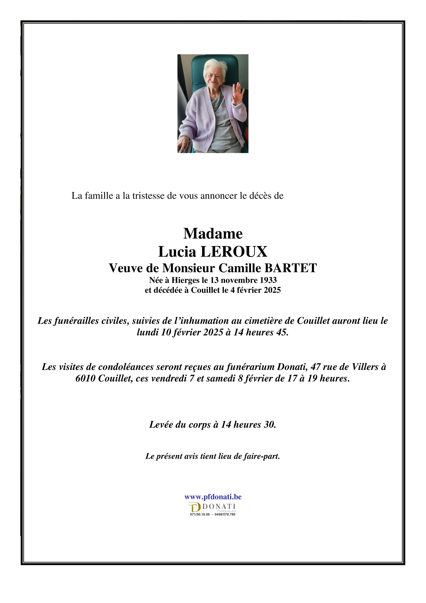 Décédée à Couillet (6010) le mardi 4 février 2025 à l'âge de 91 ans