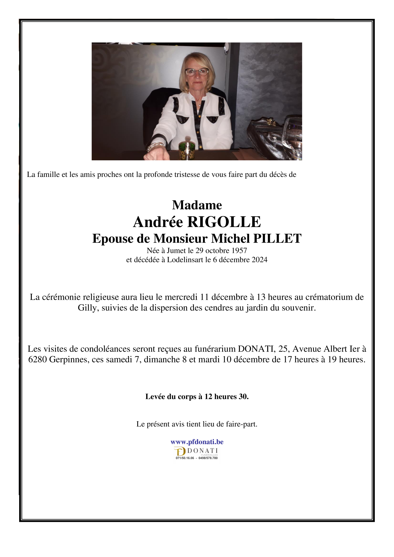 Décédée à Lodelinsart (6042) le vendredi 6 décembre 2024 à l'âge de 67 ans