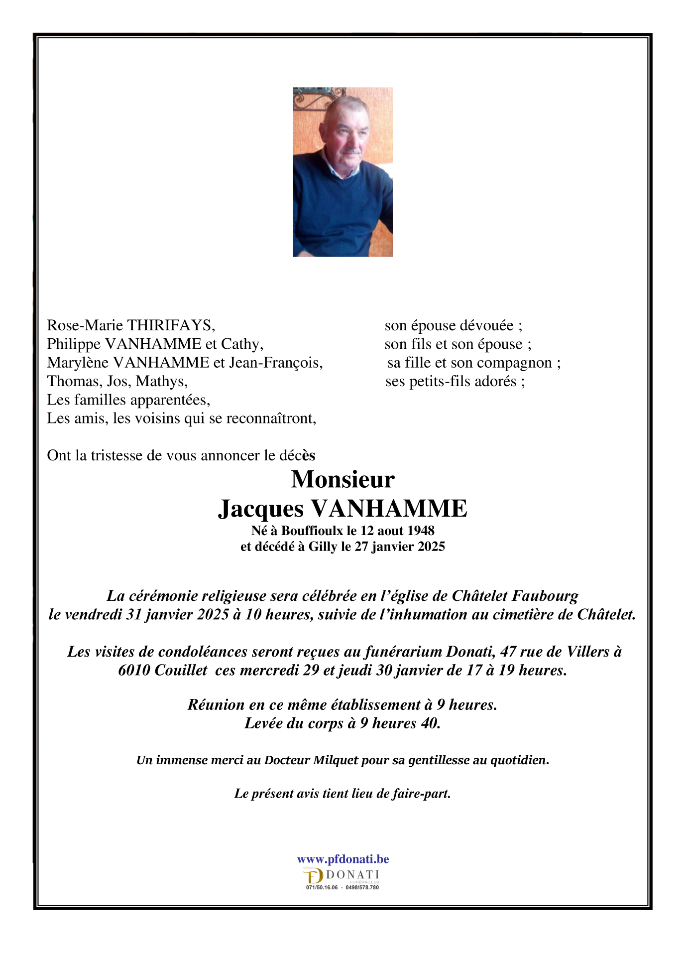 Décédé à Gilly (6060) le lundi 27 janvier 2025 à l'âge de 76 ans