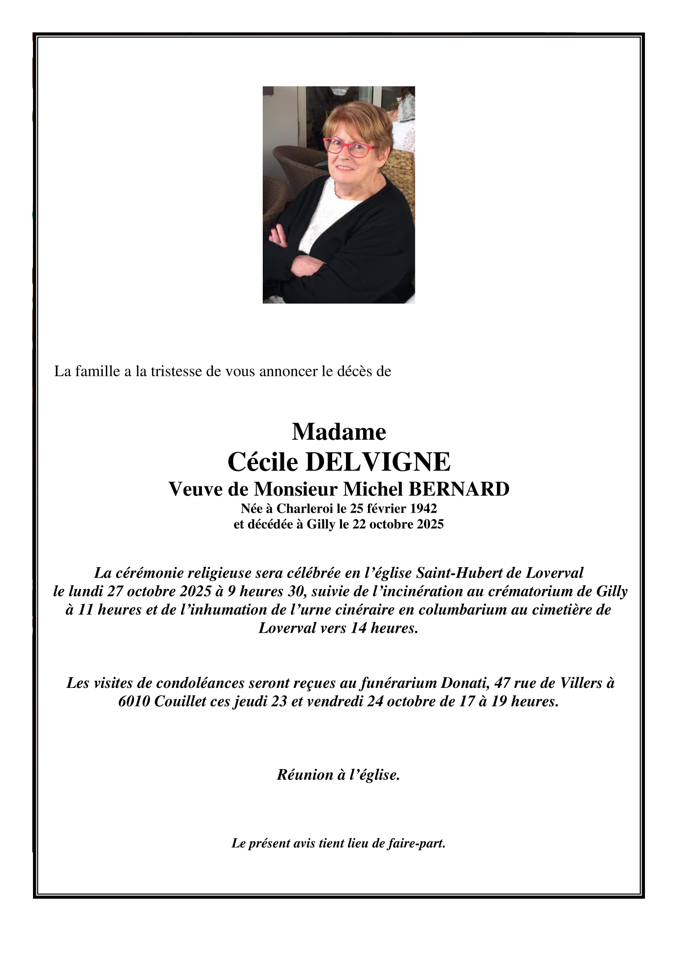 Décédée à Gilly (6060) le mercredi 22 octobre 2025 à l'âge de 83 ans
