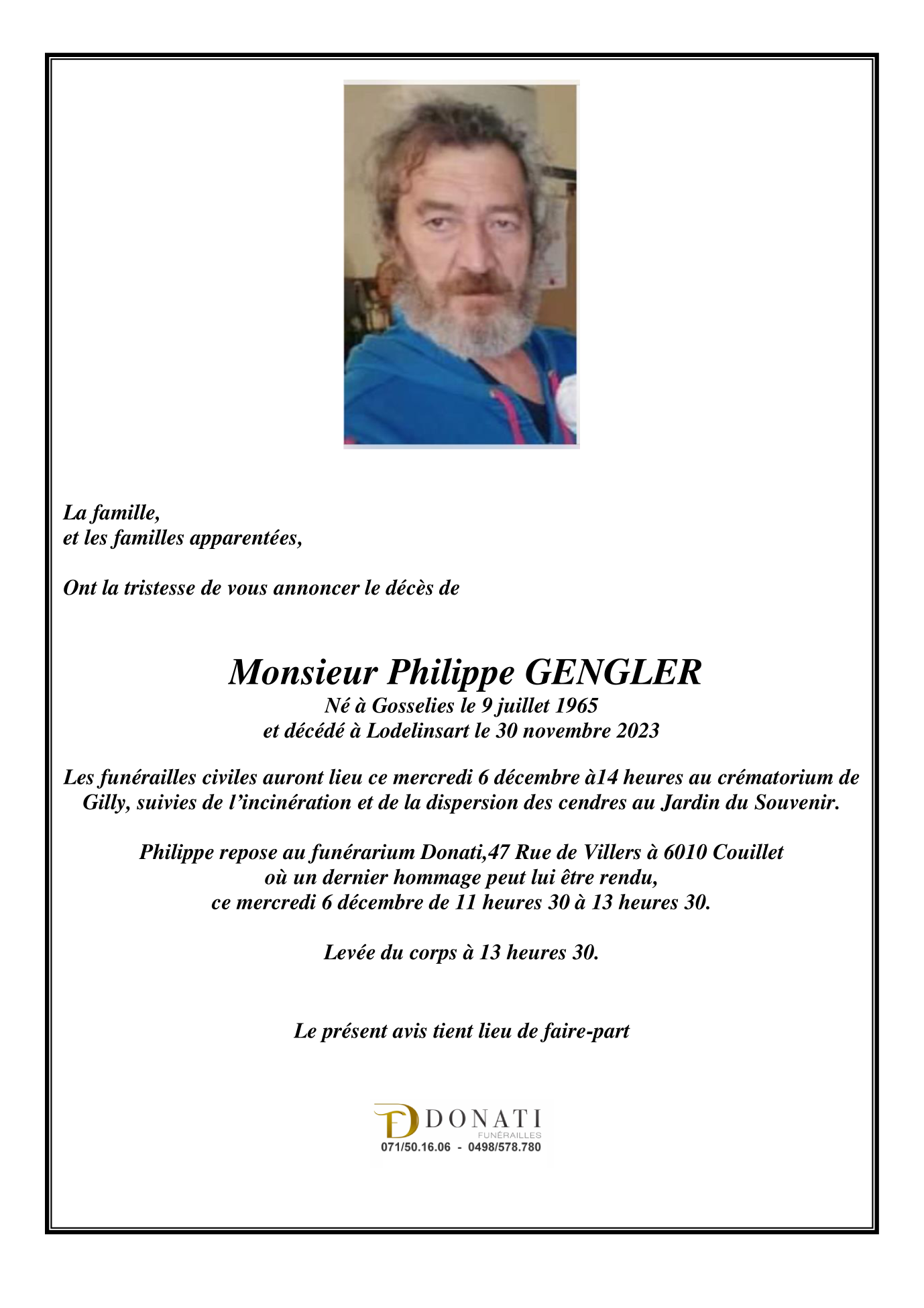 Décédé à Lodelinsart (6042) le jeudi 30 novembre 2023 à l'âge de 58 ans
