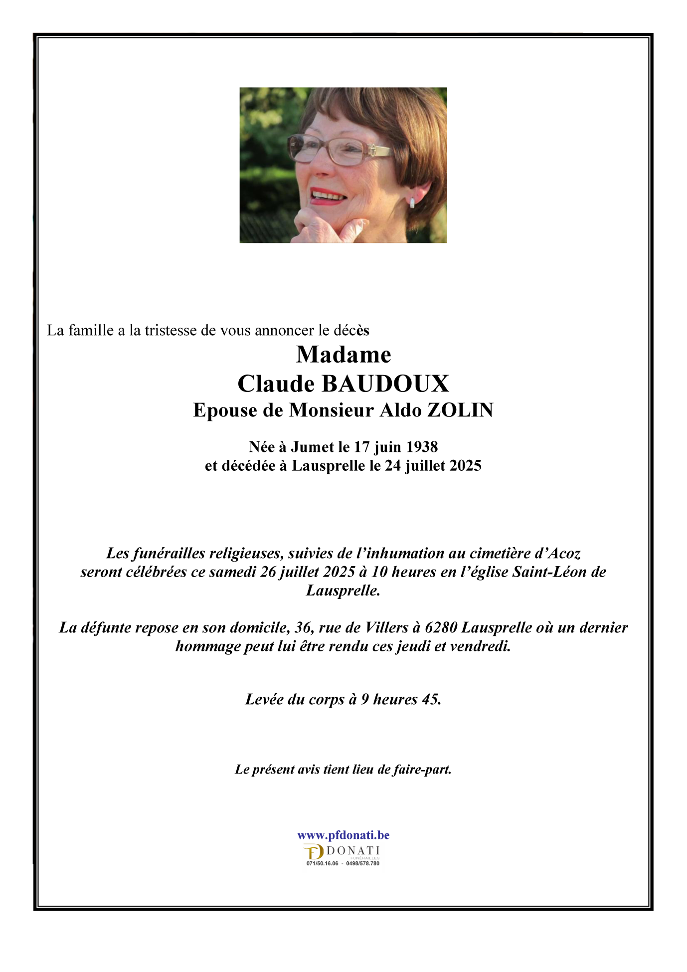 Décédée à Lausprelle (6280) le jeudi 24 juillet 2025 à l'âge de 87 ans