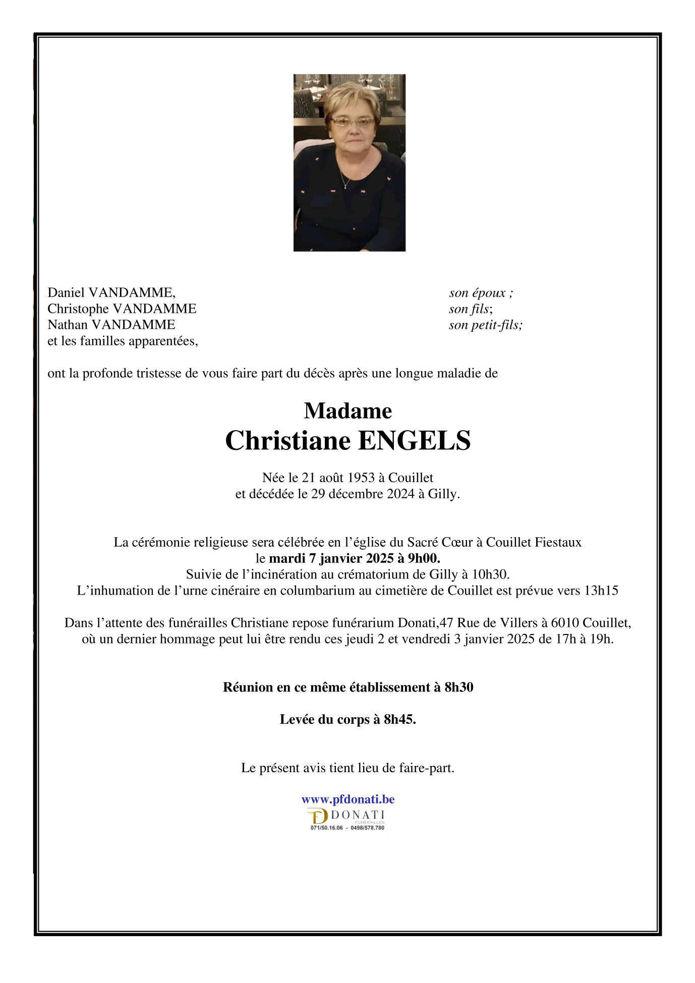 Décédée à Gilly (6060) le dimanche 29 décembre 2024 à l'âge de 71 ans