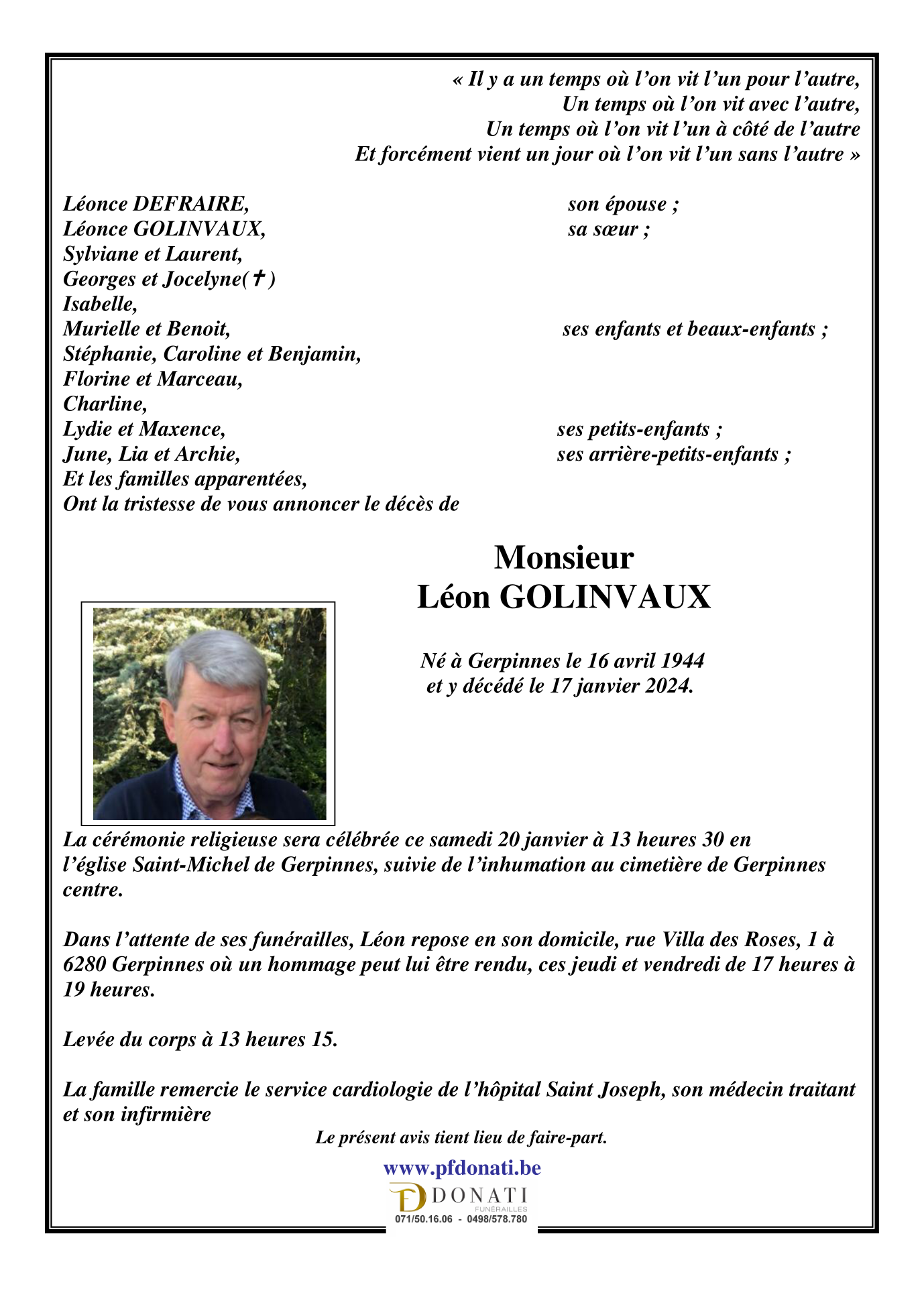 Décédé à Gerpinnes (6280) le mercredi 17 janvier 2024 à l'âge de 79 ans