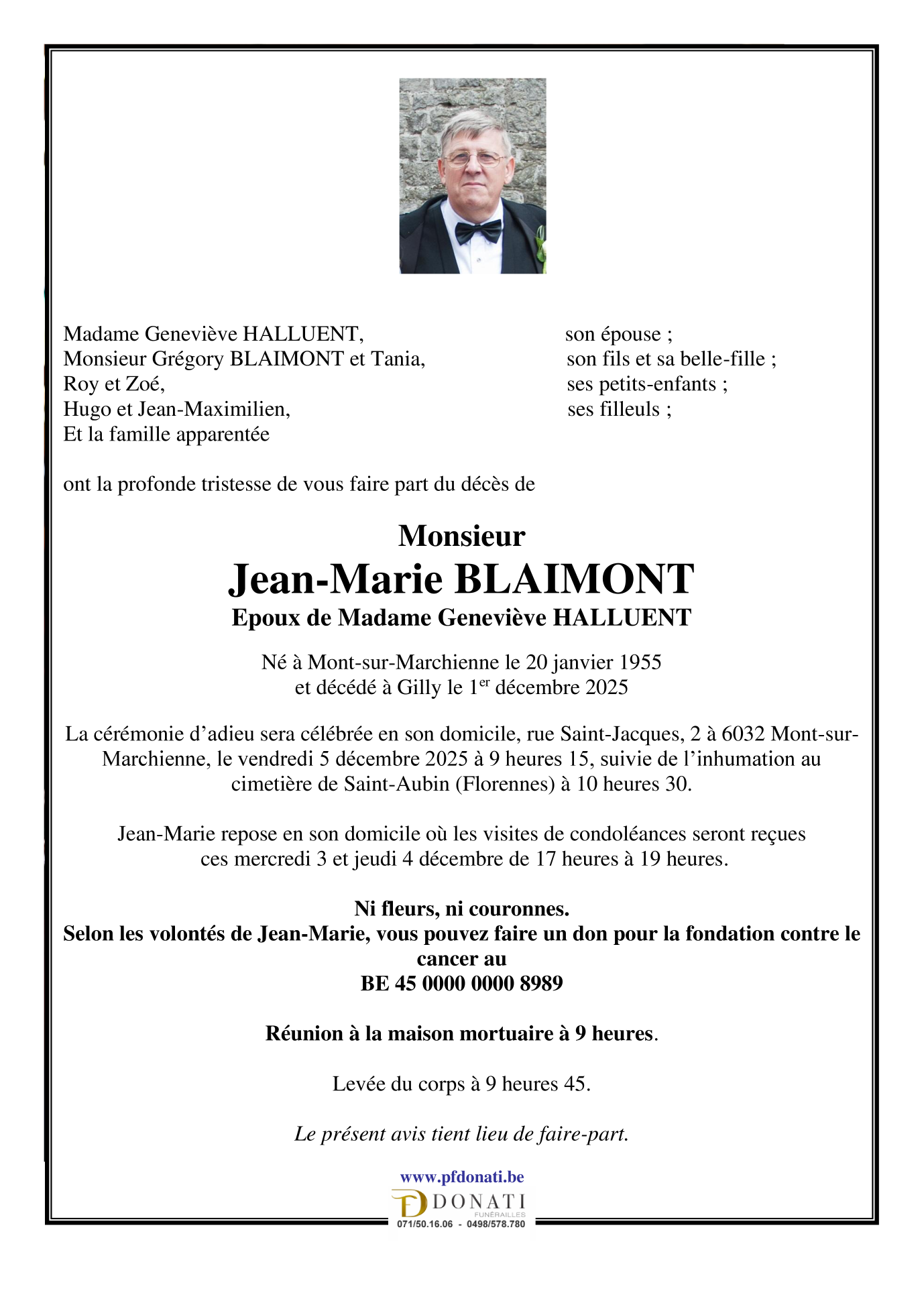 Décédé à Gilly (6060) le lundi 1 décembre 2025 à l'âge de 70 ans