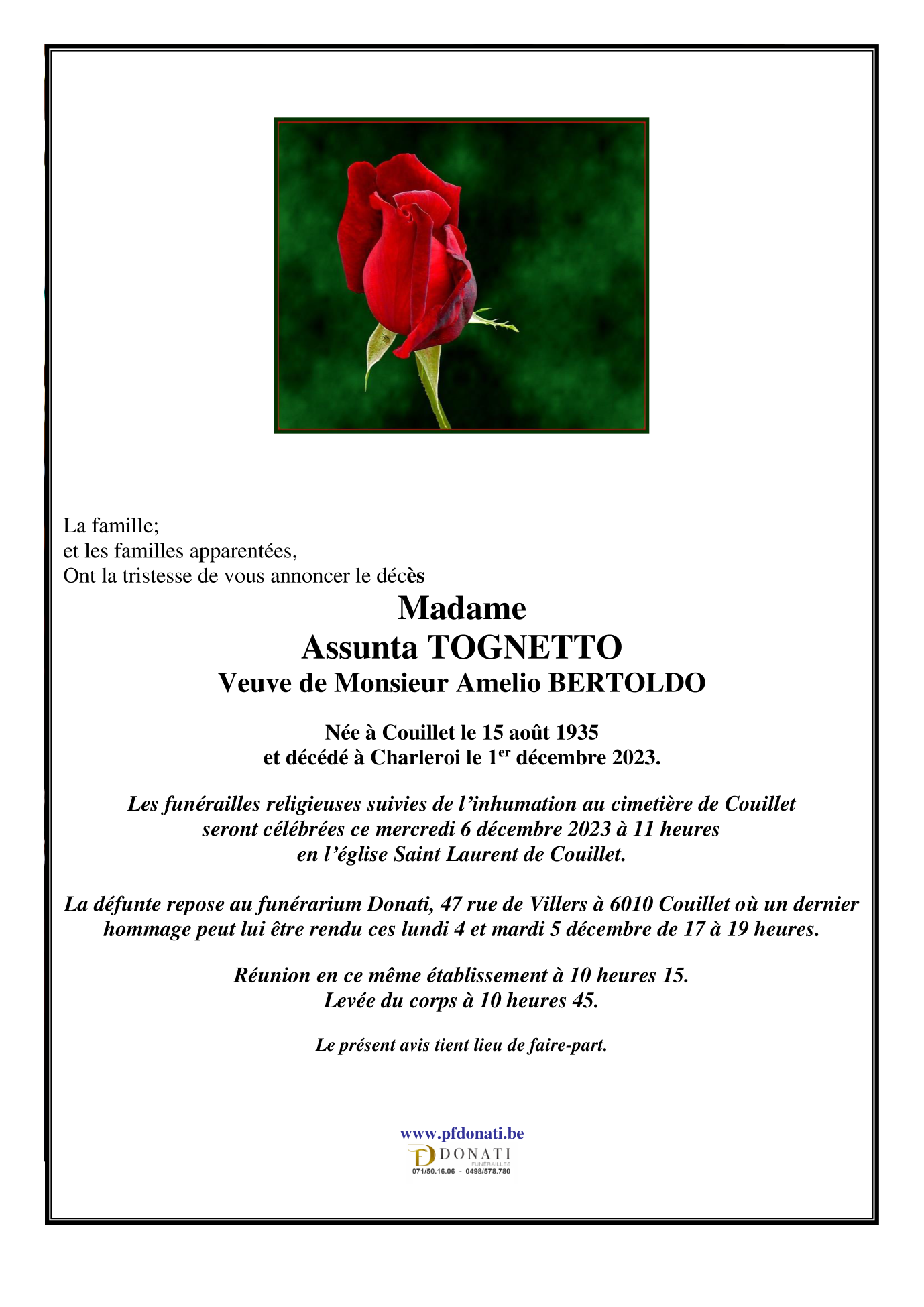 Veuve de Monsieur Amelio BERTOLDO